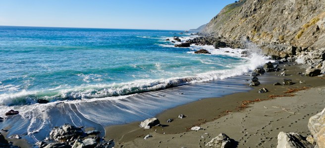 A narrow trail of sand through sap spikes took me from the forest to the cliff’s edge. The sun, unable to break the clouds, allowed the sky to hug me beside the Pacific’s expanse. Water and heaven: indistinguishable at the horizon. Ferocity made soft.