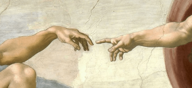 I bend to pump soap into my wet, warm hand. With my face nearer hers, I say, “hello, dear,” because she’s waving her arm at me. I reach my index finger to her and she stops waving to reach back to me. For a moment, she and I are like God and man on Michelangelo’s ceiling.