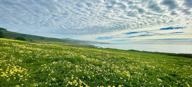 A narrow trail of sand through sap spikes took me from the forest to the cliff’s edge. The sun, unable to break the clouds, allowed the sky to hug me beside the Pacific’s expanse. Water and heaven: indistinguishable at the horizon. Ferocity made soft.