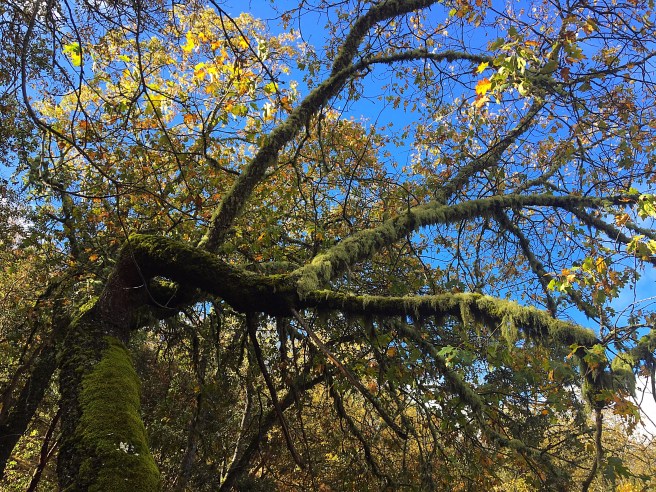 A thick oak with a large horizontal branch, an arm reaching, pulled me off the trail. I hoisted myself up, stretched my legs and reclined back. Cradled in her arm, I gazed past the canopy to the sky. Rustling, fluttering, croaking, squeaking, laughing, whistling, chattering, calling. Each voice joined in one abundant song.