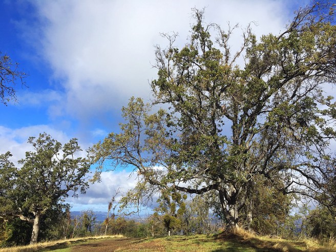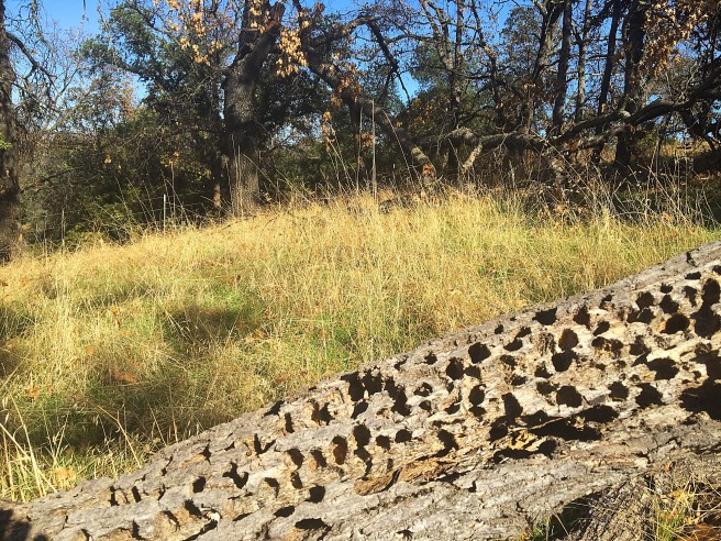 A covey of quail (dressed in fancy spots, stripes and bobbling headpieces) whistled as they ran on speeding legs. A crinkling — Towhee kicking up leaves, flying in unison on purring wings when I approached. Acorn Woodpeckers squawked, perched on tree trunks — wearing tuxedos and red caps — drilling holes, stuffing them. Their gleeful chucking like happiness on the wind. I passed a giant oak, split at it’s lowest, thickest branch — down the middle. The top half on the ground, the trunk standing a jagged obelisk, rotted at the split.
